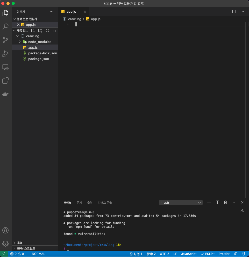 | npm init (후에 명령어 끝날때까지 엔터) npm install puppeteer |